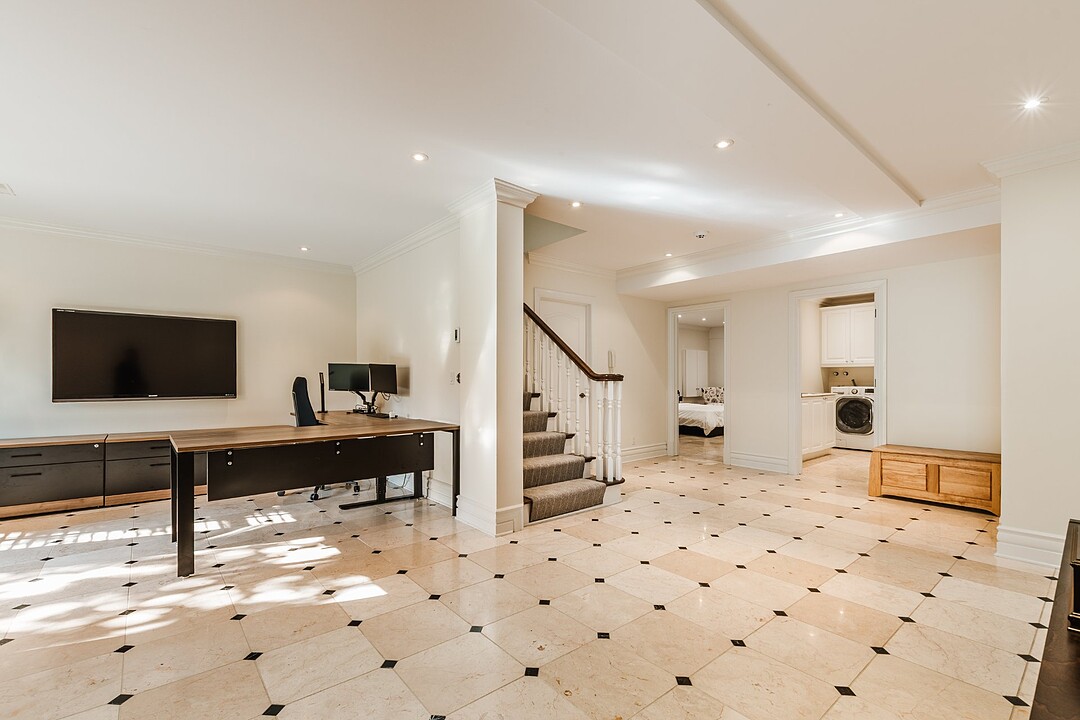 Garden Level - Versatile Walk-Out Living The bright garden-level basement offers a highly versatile extension of the home, with an extra-large family room that opens directly onto the landscaped rear yard. This level also includes a dedicated office, a guest bedroom, and a full bathroom -- ideal for visitors and home workspaces.